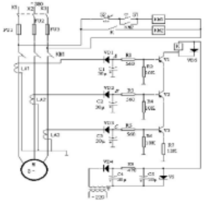 若由于某種原因造成三相電源中任一相斷相時(shí), 則該相電壓信號(hào)為零, 相應(yīng)的晶體管將截止, 使繼電器 K 和交流接觸器均釋放, 切斷電動(dòng)機(jī) M 的工作電源, 從而保護(hù)電動(dòng)機(jī)不會(huì)因缺一相電源, 變成兩相運(yùn)行, 過熱而損壞。